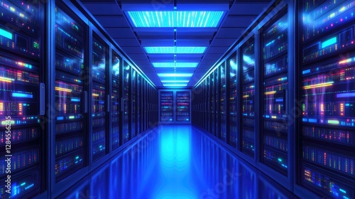 A futuristic data center with illuminated server racks and glowing blue lights reflecting on a polished floor. Ideal for technology, cloud computing, and cybersecurity concepts