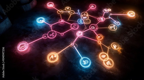 A futuristic decision tree model in glowing neon, with branches extending to various outcomes, representing predictive analytics, no background