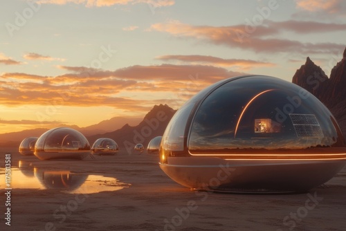 A futuristic desert settlement with solar-powered domes and advanced irrigation systems, blending seamlessly into the arid landscape