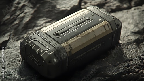 A futuristic device resting on a rocky surface, showcasing sleek design and advanced features. Ideal for themes of innovation, exploration, and technology in modern settings.