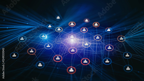 A futuristic digital concept showcasing glowing network connections with user icons, symbolizing data sharing, global communication, and digital networking in modern society.