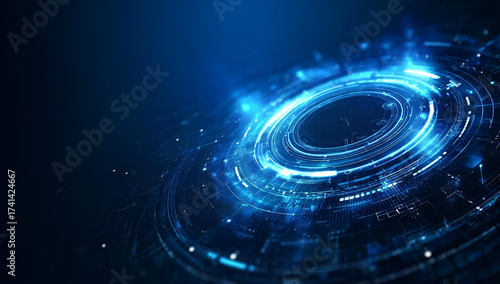A futuristic digital design featuring glowing blue circular patterns and intricate details against a dark background.