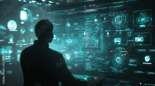 A futuristic digital interface displays interconnected glowing icons, representing customer service, call centers, and a virtual contact system