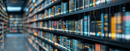 A futuristic digital library with bookshelves stretching into a glowing virtual landscape, representing the vastness of online knowledge