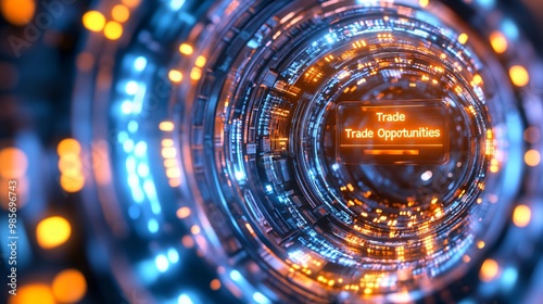 A futuristic digital tunnel representing trade opportunities with vibrant lights and intricate designs, symbolizing commerce and connection.