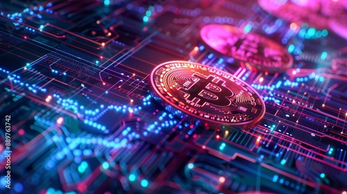A futuristic digital visualization of a cryptocurrency network, with representations of Bitcoin symbol