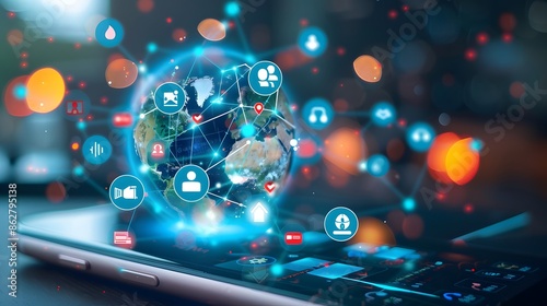 A futuristic digital world concept with a globe and icons displayed over a smartphone screen.