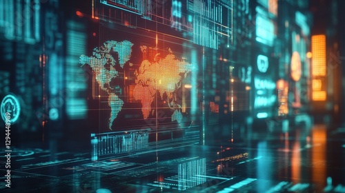 A futuristic display featuring a digital world map amidst glowing data streams and technological interfaces.