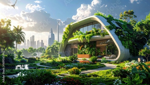 A futuristic, eco-friendly home seamlessly blends with a lush, tropical garden, overlooking a modern city.