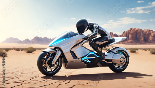 A futuristic electric motorcycle with sleek aerodynamic design, racing through a desert landscape, symbolizing speed, innovation, and sustainable transportation with copy space.