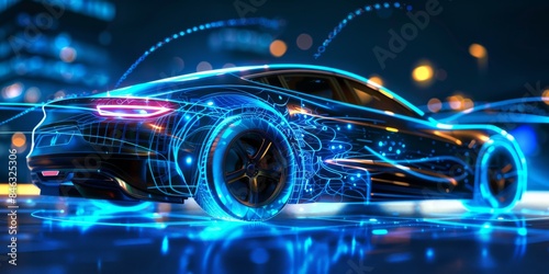 A futuristic electric sports car with neon light trails zooms through the city at night, embodying innovation and style in transportation, showcasing sleek design and advanced tech