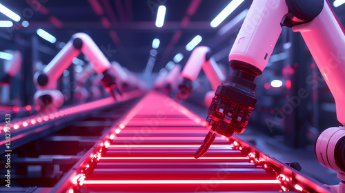 A futuristic factory scene featuring robotic arms working on a conveyor belt illuminated by red lights, showcasing advanced automation technology.