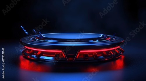 A futuristic floating platform illuminated by vibrant red and blue lights, creating an atmosphere of advanced technology and innovation. The surface is sleek and reflective.