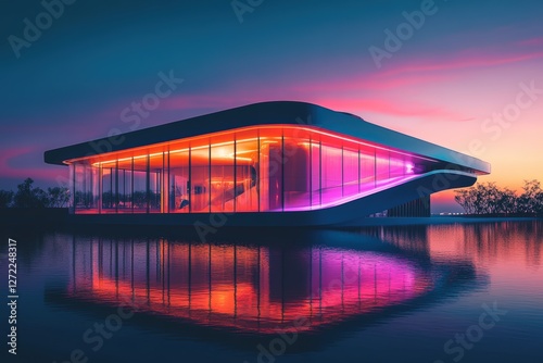A futuristic glass museum building with glowing neon lights reflecting on the water, set against a vibrant sunset sky