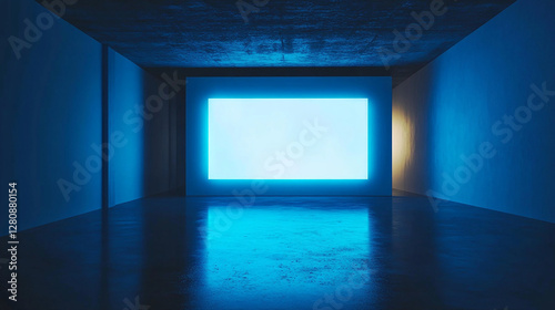 A futuristic glowing blue screen in a dark room
