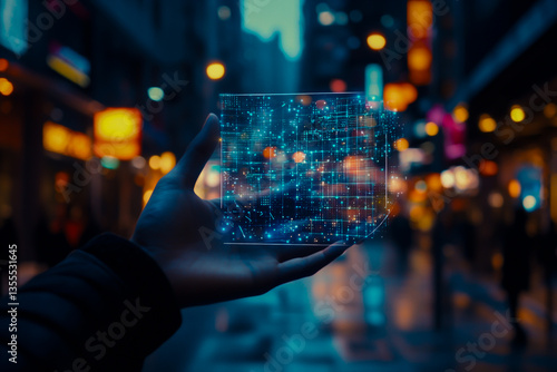 A futuristic hand holding a glowing holographic digital grid amidst a neon-lit street at night,