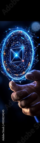 A futuristic hand holds a glowing, blue icon, surrounded by sparkling particles and light, symbolizing technology and digital connectivity.