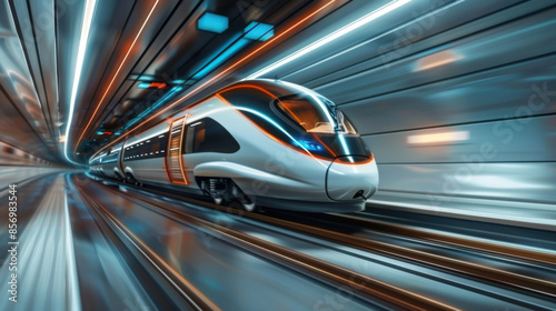 A futuristic high-speed train racing through a brightly lit tunnel, showcasing advanced technology and modern transportation.