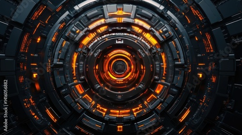 A futuristic. high-tech circular interface featuring glowing orange accents and intricate mechanical details. set against a dark. digital backdrop. ideal for technology-themed projects