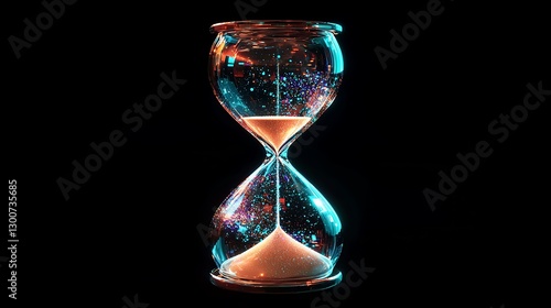A futuristic holographic hourglass with digital particles flowing, displayed on a solid black background.