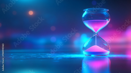A futuristic hourglass with glowing sand representing time and innovation set against a bright background with blurred space on the side conveying a sense of opportunity and limitless potential