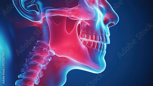 A futuristic human skeletal scan scene, a side view of a human skeleton in blue and red tones, highlighting the jaw and cervical spine, deep blue gradient background