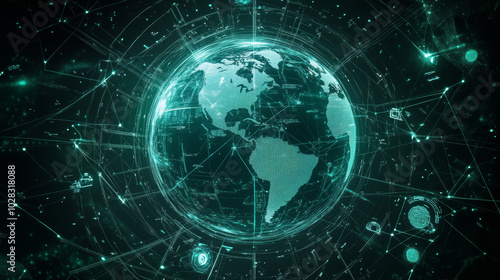 A futuristic illustration shows a globe connected by digital lines, representing a global network. It uses AI and virtual technology to show how the world is linked through communication systems.