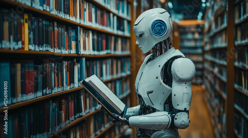 A futuristic library featuring a humanoid robot librarian assisting students in finding books. A vision of AI-powered education, blending technology and learning seamlessly.