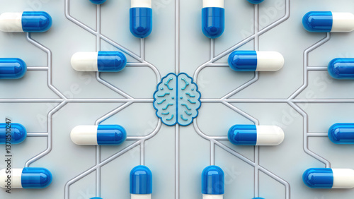 A futuristic medical diagram illustrating smart pill technology and its applications in healthcare. Pill medical for brain function,