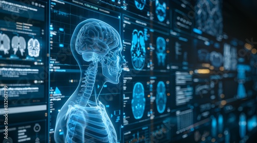 A futuristic medical interface displaying a digital human body and various data visualizations.