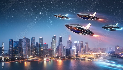 A futuristic metropolis skyline illuminated by neon lights, with sleek hovercrafts soaring through the bustling streets below, against a backdrop of a star-filled sky