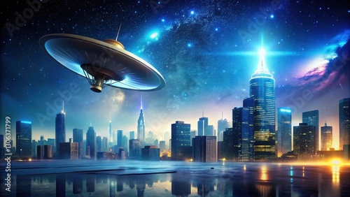 A Futuristic Metropolis Under a Night Sky with a Celestial Craft Hovering