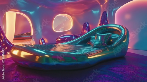A futuristic modern room with a glossy teal couch, metallic cushions, and a gradient purple rug