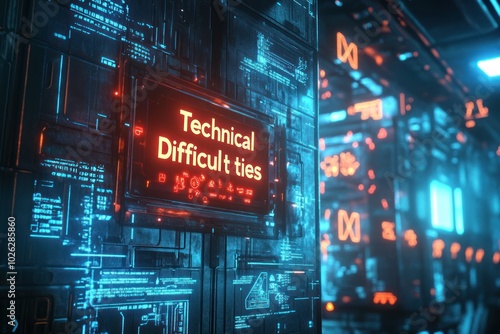 A futuristic, neon sign displays the words "Technical Difficulties" in a room with glowing blue circuit boards.