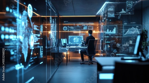 A futuristic office environment where AI-powered holographic interfaces help workers