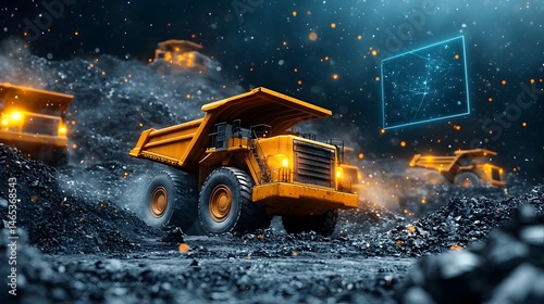 A futuristic open pit mining scene with autonomous dump trucks and holograms hovering over the site showcasing technological advancements in the mining industry