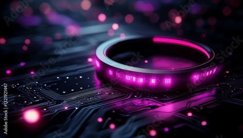 A futuristic ring with glowing pink lights placed on a dark circuit board background, emphasizing technological advancement and innovation in wearable devices