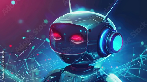 A futuristic robot, a chat bot with neon lights against the backdrop of the digital web
