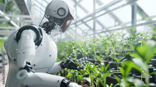 A futuristic robot with a sleek design carefully tending to young plants in a greenhouse.