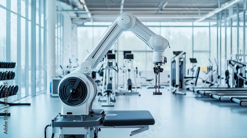 A futuristic robotic arm performing automated assembly of high-tech fitness equipment in a clean, advanced fitness tech lab, modern and efficient environment with a focus on fitness technology