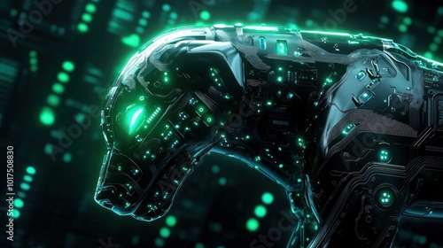 A futuristic robotic dog with glowing circuitry against a digital backdrop.