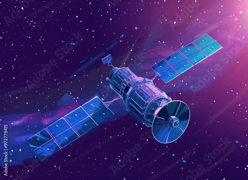 A futuristic satellite floating in the vibrant cosmos surrounded by colorful nebulae and stars High tech design with solar panels