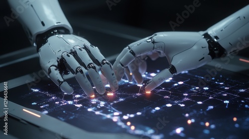 A futuristic scene unfolds, where the hands of a robot intertwine with a human, their fingertips gently touching the glowing nodes of a vast big data network, symbolizing the seamless integration of