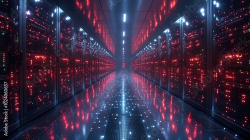 A futuristic server room with rows of glowing servers and a reflective floor.