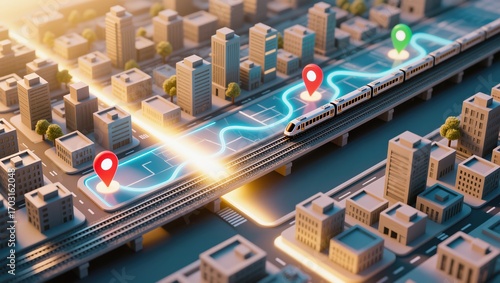 A futuristic smart city scene shows the modern train traveling upon elevated tracks featuring glowing navigation markers and route lines, illuminated by warm sunset light within an urban setting