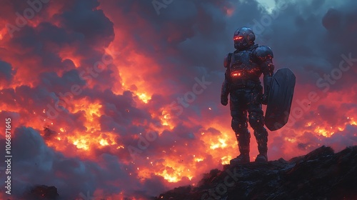 A futuristic soldier stands on a rocky outcrop, gazing at a fiery, apocalyptic landscape.