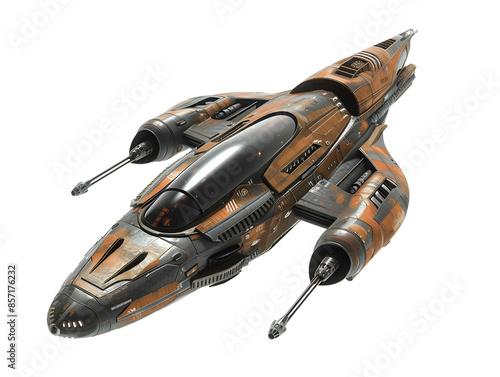 A futuristic spaceship with a sleek design, featuring a camouflage pattern and detailed weaponry.