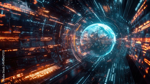 A futuristic trade concept with a digital hologram of Earth, interactive network lines, cyber-inspired, rich neon hues, clean and modern