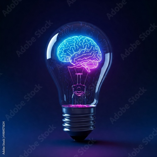 A futuristic translucent light bulb filled with circuitry and an artificial intelligence brain, illuminated in vibrant neon blue and purple hues.