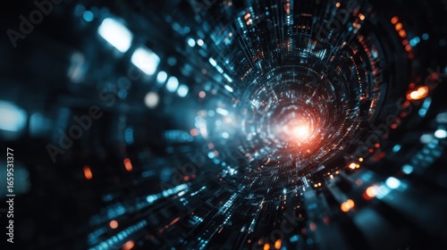 A futuristic tunnel with glowing lights and intricate patterns. The scene conveys a sense of advanced technology and digital exploration.